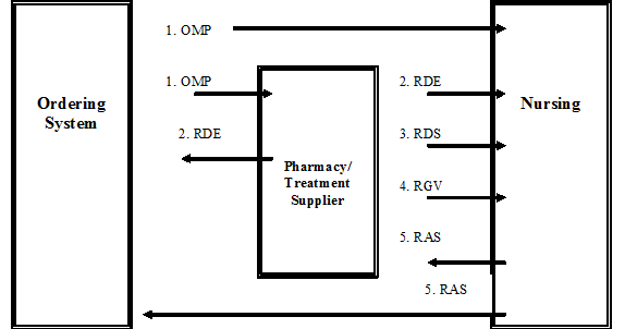 The Order Entry transaction set provides for the transmission of orders or information about orders between applications that capture the order, by those that fulfill the order, and other applications as needed. An order is a request for material or services, usually for a specific patient. These services include medications from the pharmacy, clinical observations (e.g., vitals, I&Os) from the nursing service, tests in the laboratory, food from dietary, films from radiology, linens from housekeeping, supplies from central supply, an order to give a medication (as opposed to delivering it to the ward), etc.