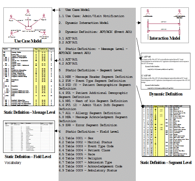 The static definition is an exhaustive specification for a single message structure (see Section 2.B.4, "Static definition"). Normatively expressed as an XML document validated against the normative message profile Schema, it may be registered on the HL7 web site (see Section 2.B.10, "Message profile document").
