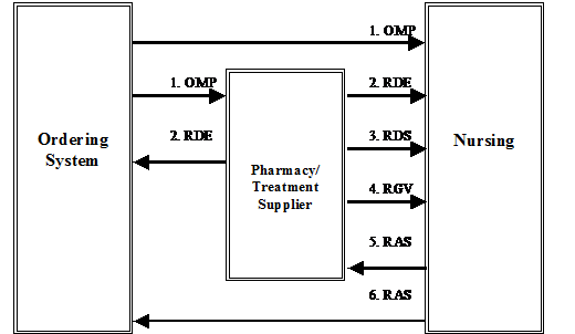 The pharmacy/treatment application may send the RDE, the Pharmacy/Treatment Encoded Order message, a fully encoded order to the Nursing application, Ordering application, and/or other system applications as appropriate at the site.