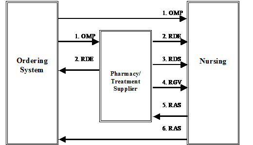 The pharmacy/treatment application may send the RDE, the Pharmacy/Treatment Encoded Order message, a fully encoded order to the Nursing application, Ordering application, and/or other system applications as appropriate at the site.