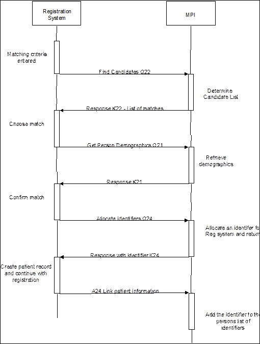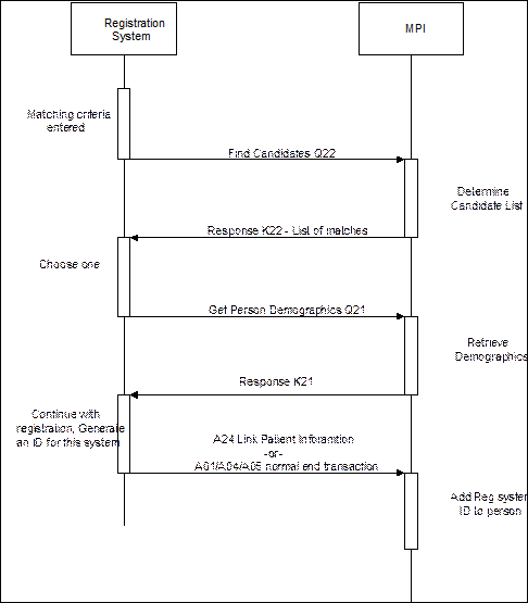 A24 or A01/A04/A05 - This transaction is to update the MPI with the new identifier the client system has created for the person. It is acceptable for systems to simply send an A01 Admit/visit notification, A04 Register a patient or A05 Pre-admit a patient as may have been done traditionally, with the new client system identifier and the existing MPI enterprise identifier in PID-3. However an A24 Link patient information may be sent instead, with one PID segment containing the MPI enterprise identifier for the person, and the second PID segment containing the new registration system identifier.