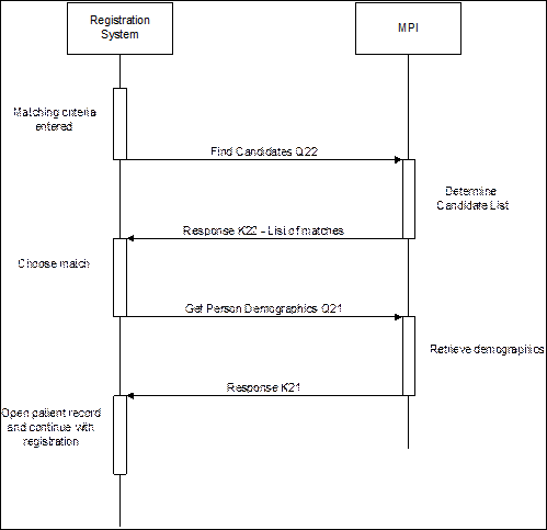 In this scenario, a client system (e.g., a registration system) will query an MPI for a person, and the person record exists on both systems. The MPI returns a list of possible matching candidates, and one is chosen by the user on the client system. The client system simply asks the MPI for an updated set of demographics and does not assign an identifier since the person already exists with an identifier on the client system.