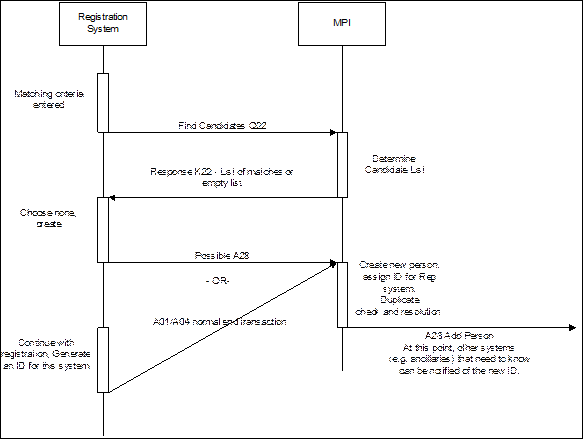 If the client system assigns a person identifier when the record is created, an A28 Add person information could be sent to the MPI to notify it of the record creation. If the client system does not create an identifier until the registration is completed, the A01, A04 or A05 events could serve the purpose of notifying the MPI of an added person and identifier. The fact that the person will have an identifier unknown to the MPI, and no enterprise identifier, will allow the MPI to infer that a person record is being added.