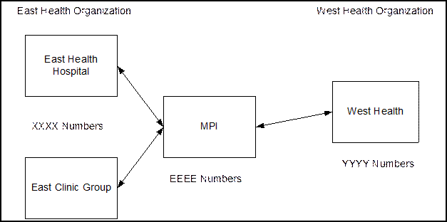 Later West Health Organization is bought and merged with East. West has been using its own identifier domain (YYYY numbers). An MPI is also implemented to keep a cross-reference between the two systems, and assigns its own enterprise identifier (EEEE number) to each patient.