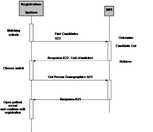 Q22/K22 Find Candidates - This signals the MPI to search its database for a list of persons that match the demographic criteria sent in the query, using whatever algorithms it has at its disposal, or using the algorithm optionally specified in the query. The response includes a list of "candidates" that matched the criteria in the query, one PID segment for each candidate. The query can also specify the identifier domains to return in PID-3 - Patient Identifier List, so that the client system identifier and the MPI enterprise identifier could be returned for each match.