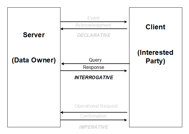 The imperative model is employed for remote interoperation. A Client initiates a request for action (such as an order) to the Server. The Server processes the request and responds with a report of success or failure to the Client.