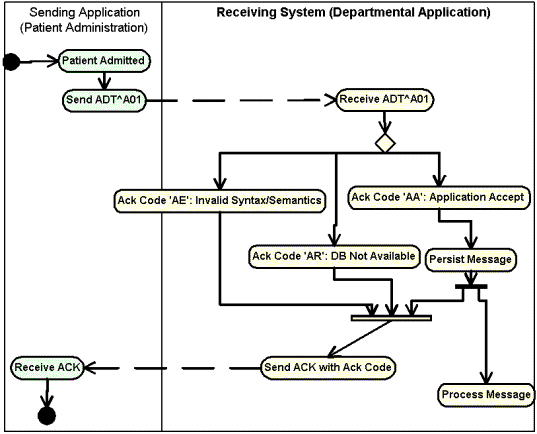The HL7 acknowledgment paradigm has been extended to distinguish both accept and application acknowledgments, as well the conditions under which each is required. With a positive accept acknowledgment, the receiving system commits the message to safe storage in a manner that releases the sending system from the need to resend the message. After the message has been processed by the receiving system, an application acknowledgment may be used to return the resultant status to the sending system.