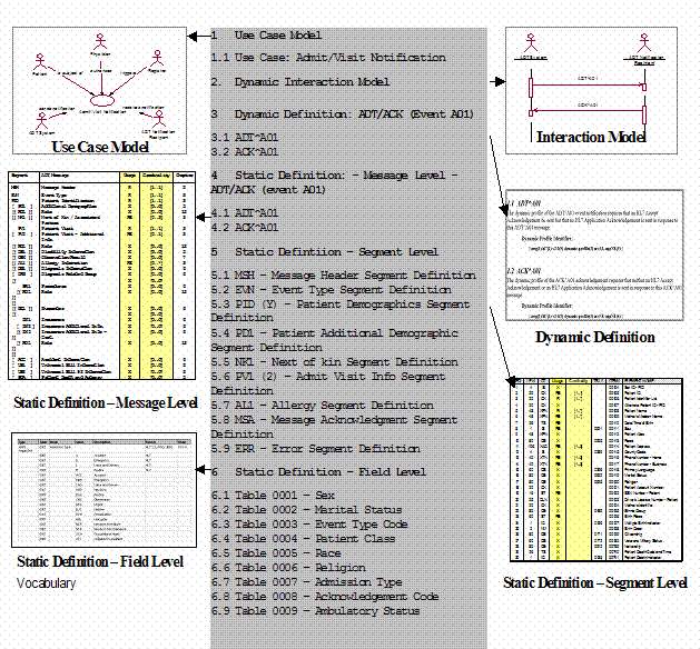 The static definition is an exhaustive specification for a single message structure (see Section 2.B.4, "Static definition"). Normatively expressed as an XML document validated against the normative message profile Schema, it may be registered on the HL7 web site (see Section 2.B.10, "Message profile document").