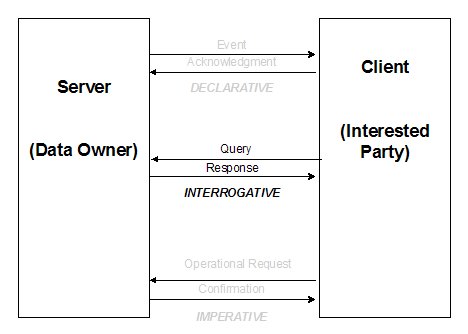 The imperative model is employed for remote interoperation. A Client initiates a request for action (such as an order) to the Server. The Server processes the request and responds with a report of success or failure to the Client.