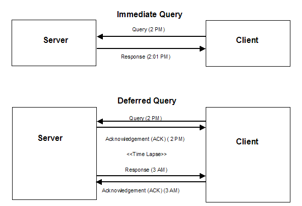 The interrogative model is employed for queries. A Client initiates a query (a request for data) to the Server. The Server processes the query, responds with a report of success or failure of the query to the Client, and further responds by delivering information requested by the query.