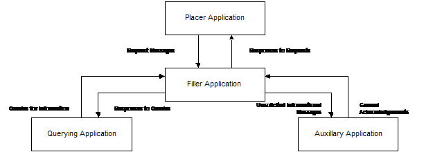 In this specification, there are four roles that an application can assume: a filler application role, a placer application role, a querying application role, and an auxiliary application role. These application roles define the interaction that an application will have with other applications in the messaging environment. In many environments, any one application may take on more than one application role.